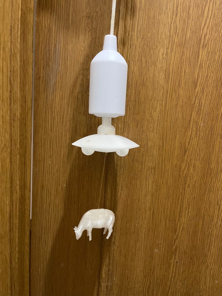 ペンダントライトを作ってボランティアのスタッフに見せたところ・・ 先生かわいいでもこれUFOに連れ去られる猫みたい!! そうコメントもらい それならUFOも作るか 定番のアダムスキー型UFOに牛 点灯するとこんな感じです UFOめちゃ光ってます -